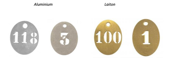 En laiton 5/10e ou en Aluminium 10/10e, ces jetons permettent l’identification d’outils, de clefs, casiers …